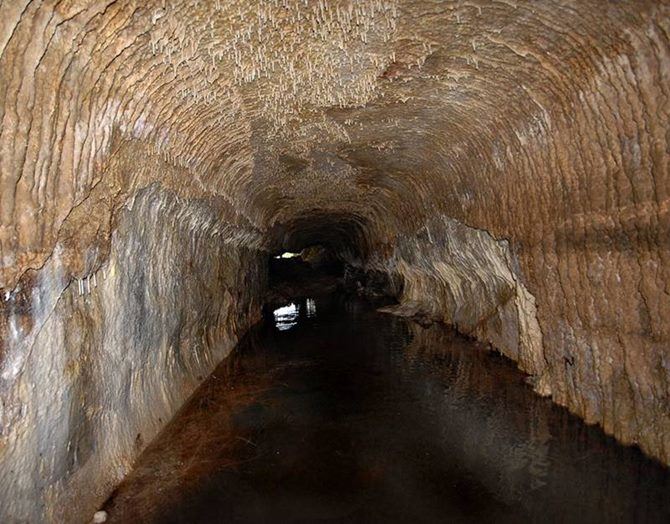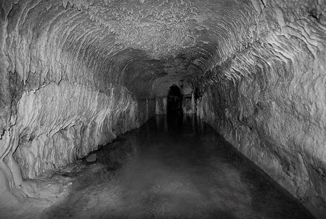 L’ingresso, un corridoio rettilineo di trenta metri, conduce in una camera centrale sormontata da una cupola di quattro metri, dove la pietra si anima di stalattiti e concrezioni sulfuree. Da una nicchia sgorga una sorgente che alimenta piccole vasche e canalizzazioni, create per incanalare acque dalle proprietà diverse: una sulfurea, intensa e pungente, e l’altra cristallina e leggera.